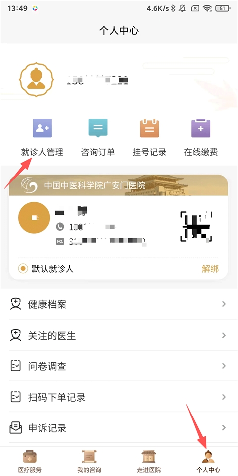 1、打开广安门医院,注册登录后点击【个人中心】-【就诊人管理】;