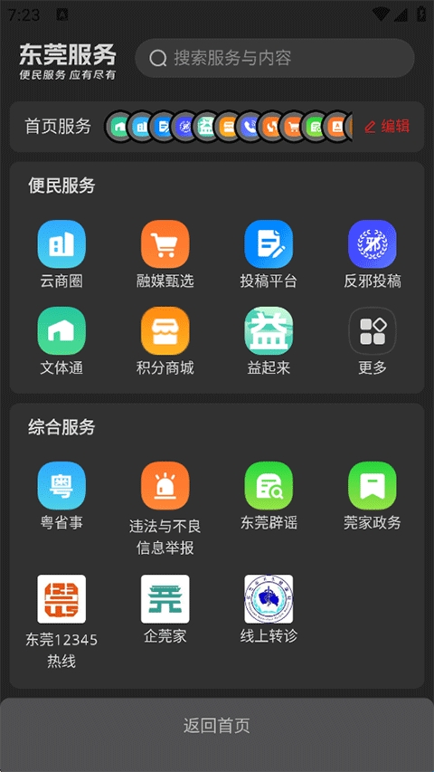 2、在首页点击更多按钮,这里集成了众多便民服务与综合服务内容;