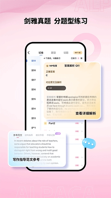 羊驼雅思app是一款学习软件,功能上软件就为用户们准备了雅思口语、雅思听力、雅思阅读、雅思写作、雅思打卡等在内的多方面服务。
