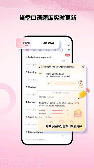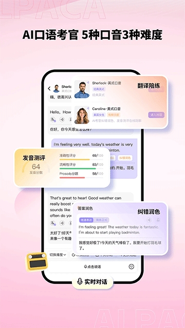 影子跟读法训练模式,针对流利度及发音AI实时评分。