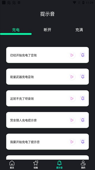 3.设置提示音:点“提示音”,给“开始充电”“断开充电”“充满电”这三种状态分别配上对应的提示音。