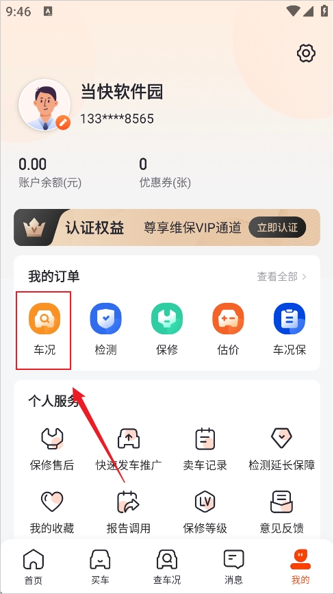 2、然后在个人主页选择车况