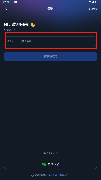 4、输入手机号码和你获得的验证码即可登录个人账号。