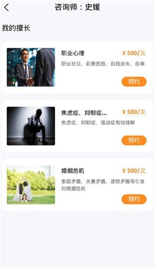 2、在心理资讯界面,你将看到许多专业的心理咨询师的信息;这些咨询师都是经过严格筛选和培训的,他们拥有丰富的经验和专业知识;你可以浏览他们的个人简介和擅长类型,以便找到最适合你的咨询师;一旦你找到了合适的咨询师,点击预约按钮即可;