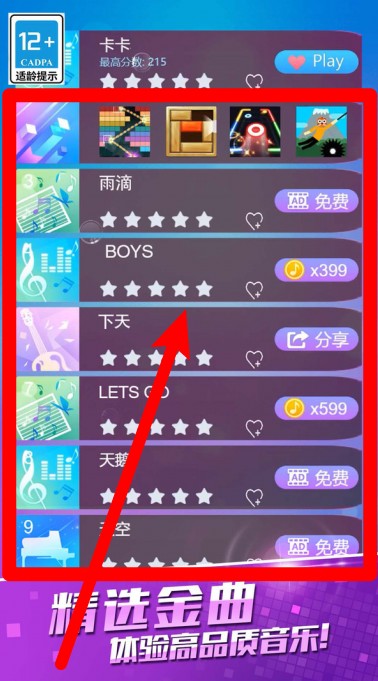 2.在每一首精选金曲中选择最喜欢的音乐,跟随旋律点击方块来挑战高分纪录。