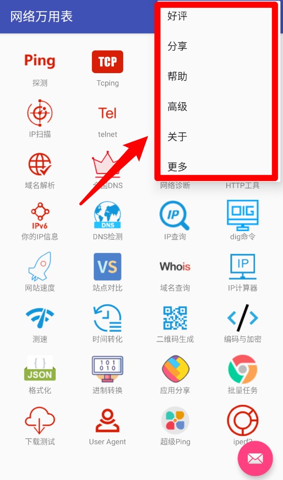 1、打开网络万用表,可选择Ping、Traceroute、域名解析等丰富网络工具功能入口使用。