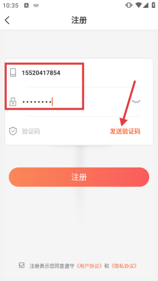 2、在注册页,填写手机号、密码后,点击【发送验证码】获取短信验证码。
