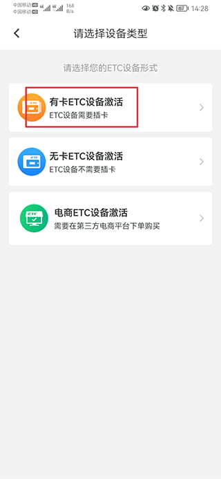 2、选择激活的设备类型,如有卡ETC设备激活;