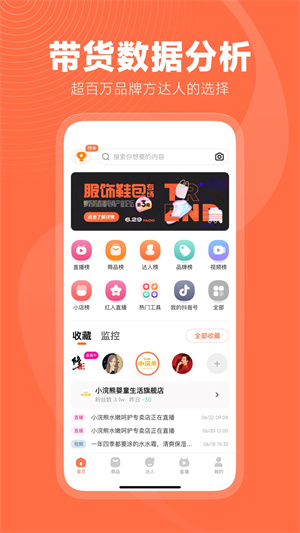 2、为网红达人、供应链商家、MCN机构提供直播&短视频电商深度整合一站式数据解决方案。你身边的专业抖音电商直播带货助手!