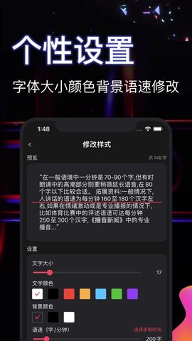 1、提词设置支持字体、播放速度自定义设置,不论是优雅的朗诵还是快速的快读。