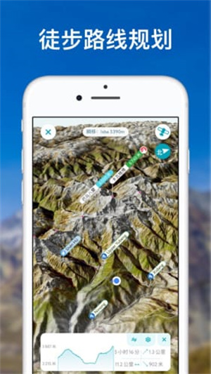 通过网罗全球无数远足路径与步道,能帮助你规划远足路径.、评估步行距离、获得纵剖面信息与预估时间。为了便于你规划路径行程,我们还在 3D 地图中加入了山间小屋、停车场、缆车、观景位置与城堡等你可能感兴趣的地点。