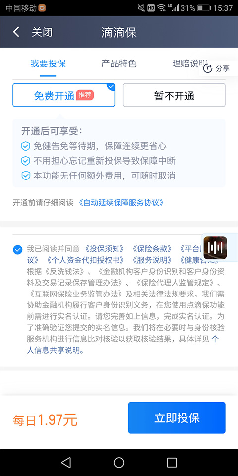5、并免费开通续保服务,以及勾选同意相关条款须知后点击【立即投保】