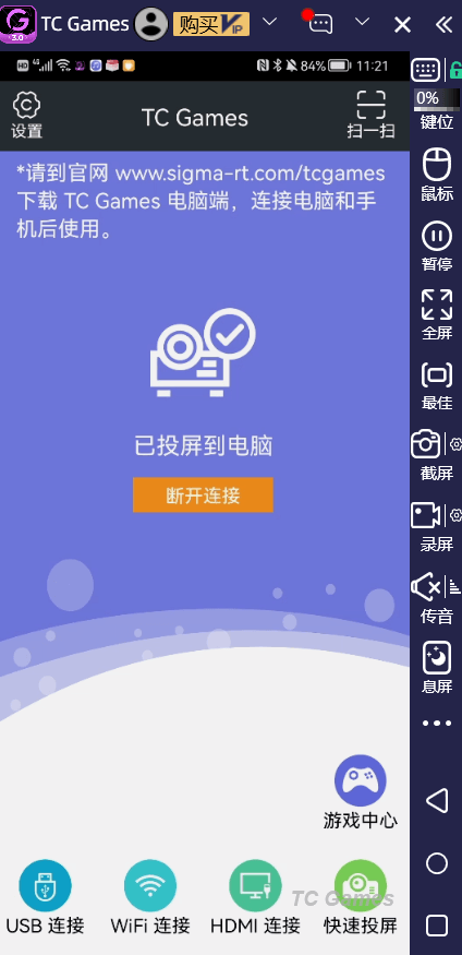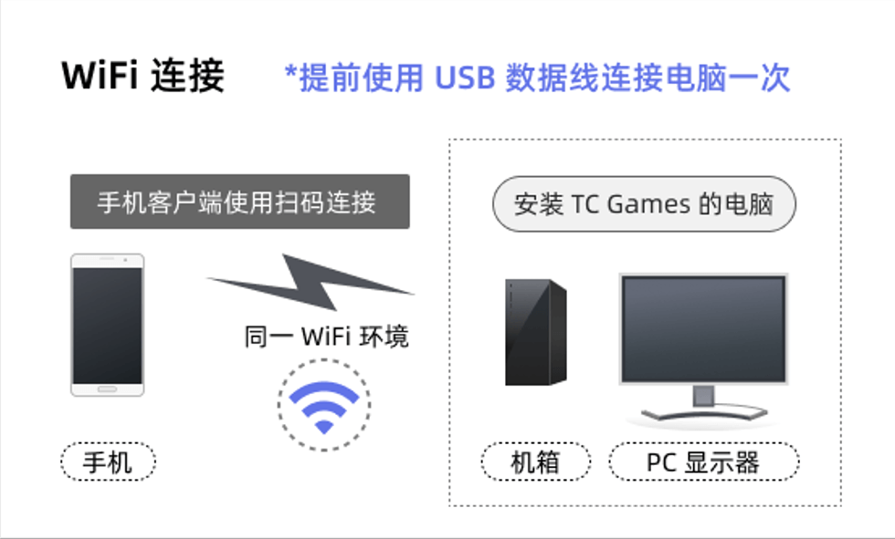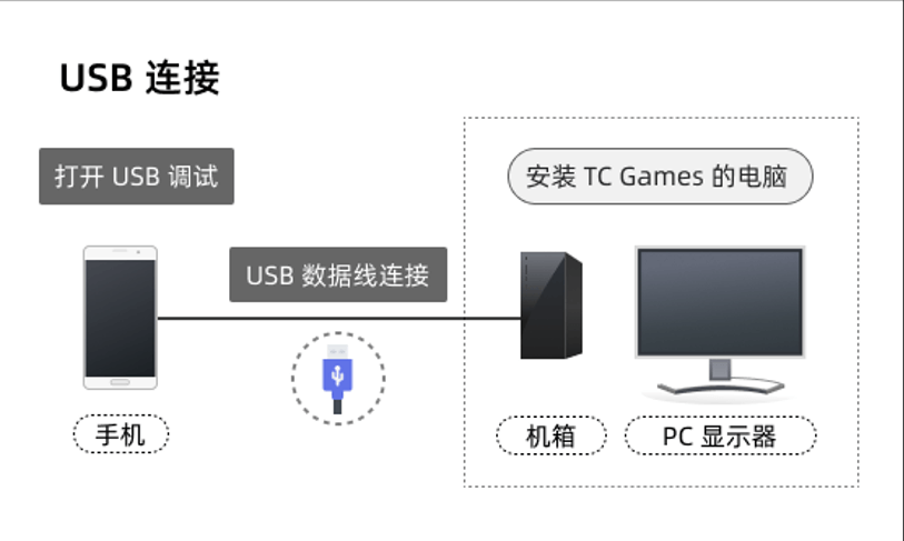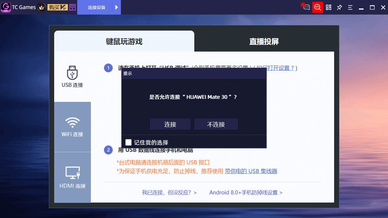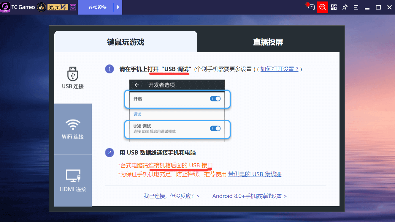 在TC Games客户端中上方选择连接设备,用USB数据线连接手机和电脑,按照提示进行连接