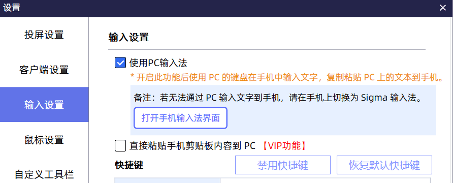 输入设置中,打开“使用PC输入法”后,可通过电脑的键盘在手机中输入文字,复制粘贴文本到手机