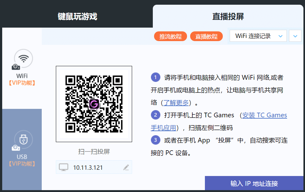 3、在TC Games客户端填写手机IP地址,或点击已发现设备列表进行连接;