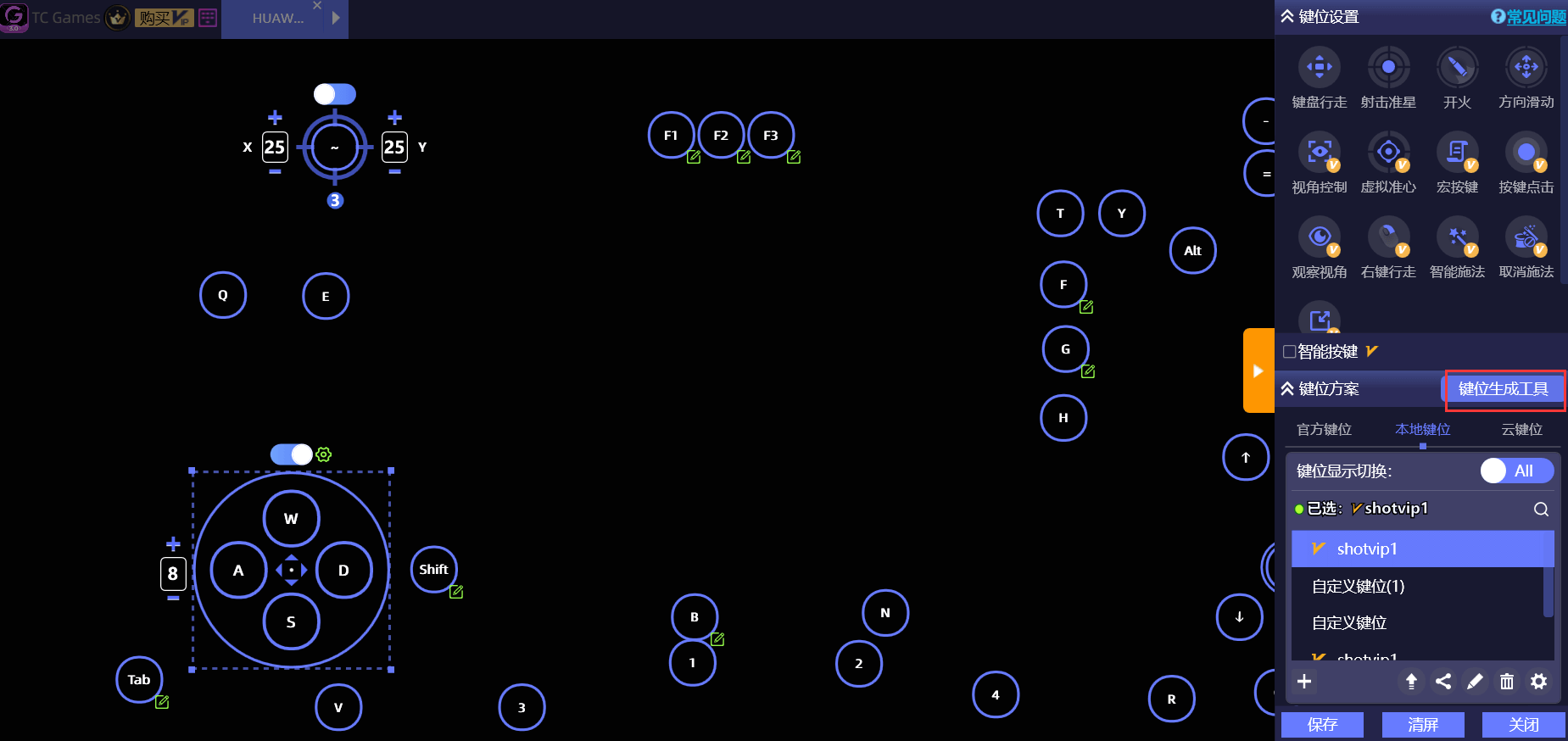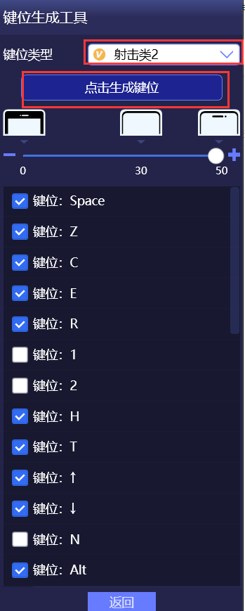用户可以软件右侧菜单栏,选择键位,进行键位自定义设置,使用键位生成工具可以快速生成各类手机游戏模板按键。