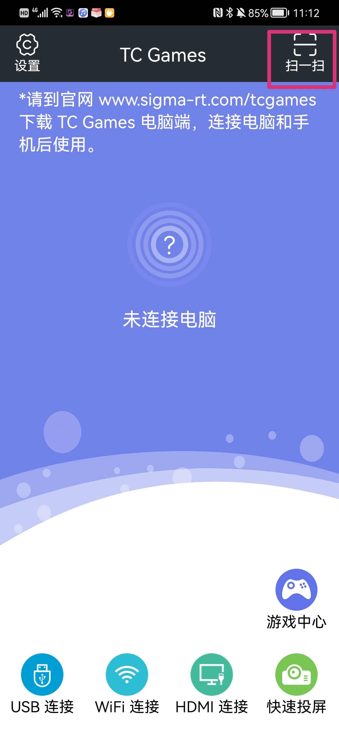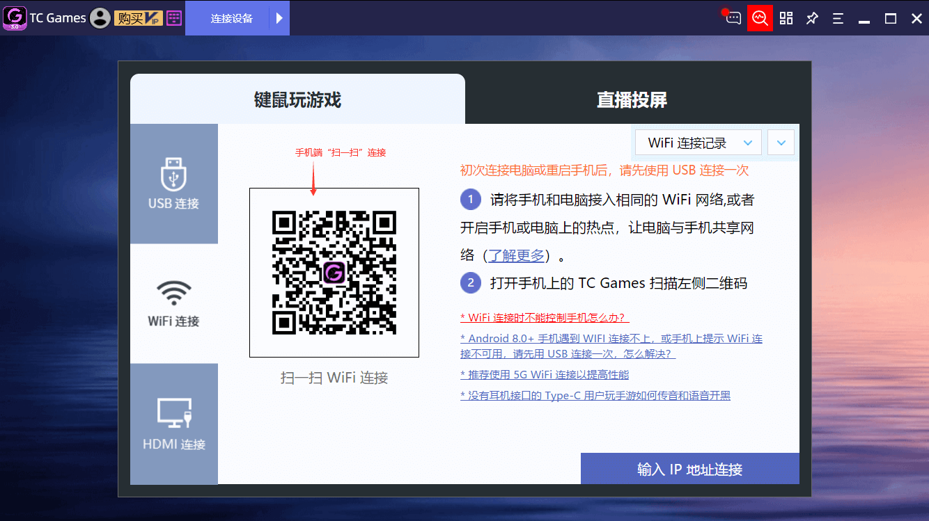 完成网络设置后,打开手机端TC Games,在右上角点开“扫一扫”,扫描电脑端的二维码