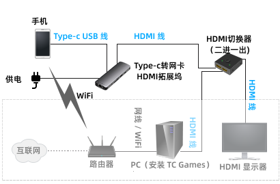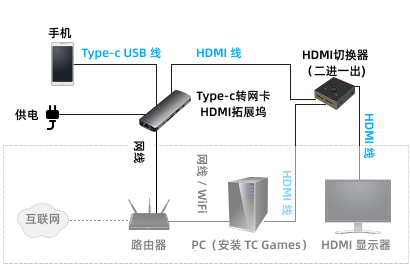 2、请按上图所示连接图,连接全部设备(部分手机需要设置HDMI模式);