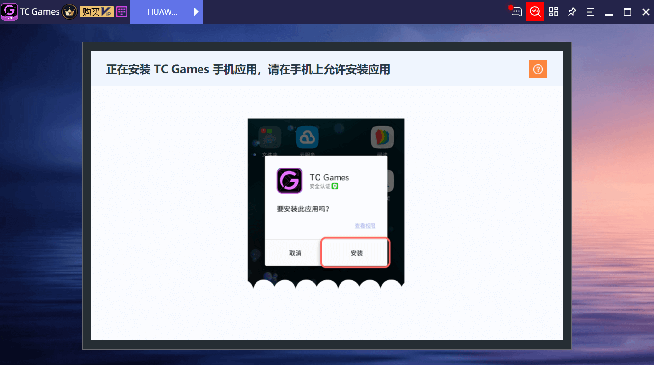 连接过程中,TC Games将自动推送手机端应用程序到电脑,按提示在手机上允许安装应用