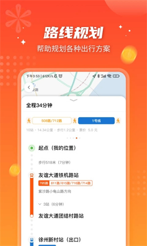 ★换乘查询:始发站可自动定位当前位置也可手动输入,输入目的地,搜索显示公交换乘方案及详情。