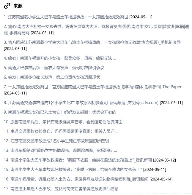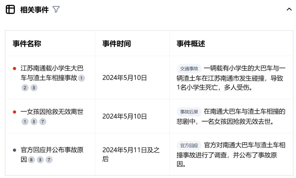 除了事件的概述和脑图以外,秘塔AI搜索还会自动的整理相关的事件,从事件名称、事件时间和事件概述这三方面了解事情发展的过程。
