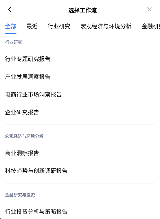 行业调研、报告撰写都可以交给AI。秘塔AI搜索有7大类、25个细分场景的工作流,涵盖行业研究、经济分析、金融投资、运营方案等各种场景。
