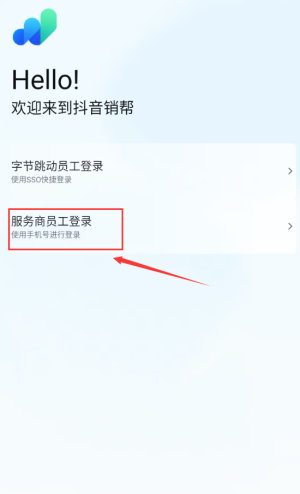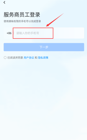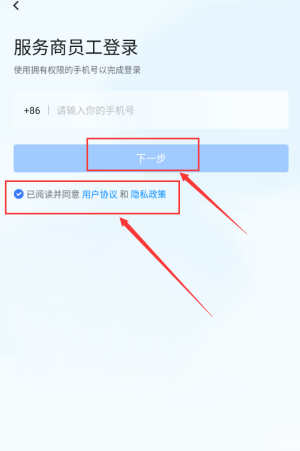 2、点击红框中的服务商登录,选择通过手机号进行登录。