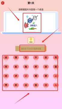 3、想玩的话,直接点击游戏入口,拿看图猜成语来说,依据图片去猜,把下方汉字按顺序填进框里就行。