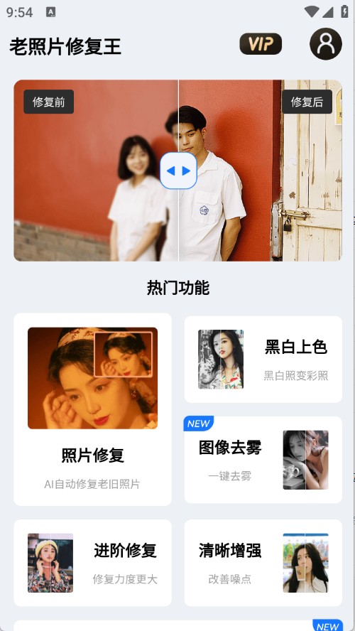 1. 在老照片修复王的首页,用户能够挑选自身所需功能来处理图片。当下所支持的功能涵盖:照片修复、照片风格转换、照片动漫化、图片无损放大、图片拉伸修复、合照修复、黑白图片上色、图像去雾、图像清晰度增强、对比度增强、人像美颜以及人像瘦脸。