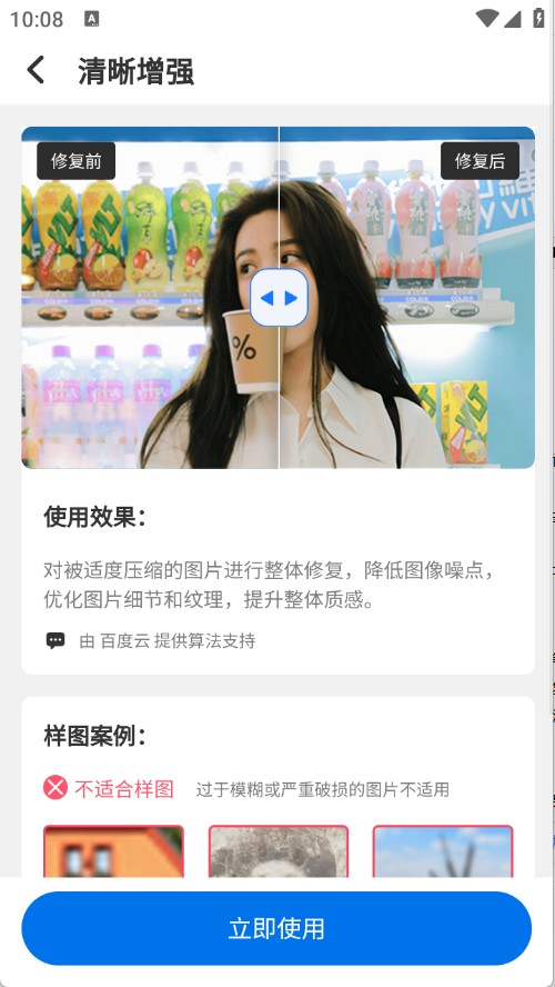 对压缩后的模糊图像实现智能快速去噪,优化图像纹理细节,使画面更加自然清晰。