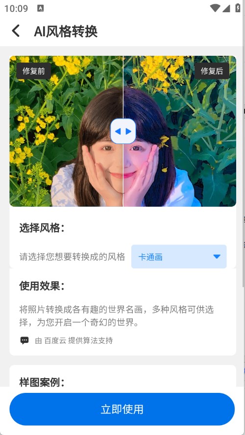 可将图像转化成卡通画、铅笔画、彩色铅笔画,或者哥特油画、彩色糖块油画、呐喊油画、神奈川冲浪里油画、奇异油画、薰衣草油画等共计9种风格。