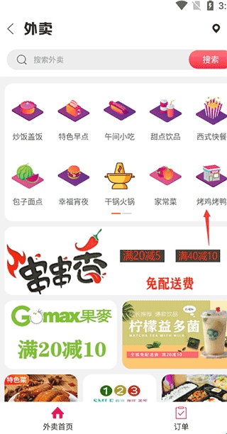 1、首先在本站下载安装好app后,进入到主页面,可以在许多功能中看到首页外卖,我们点击进去。