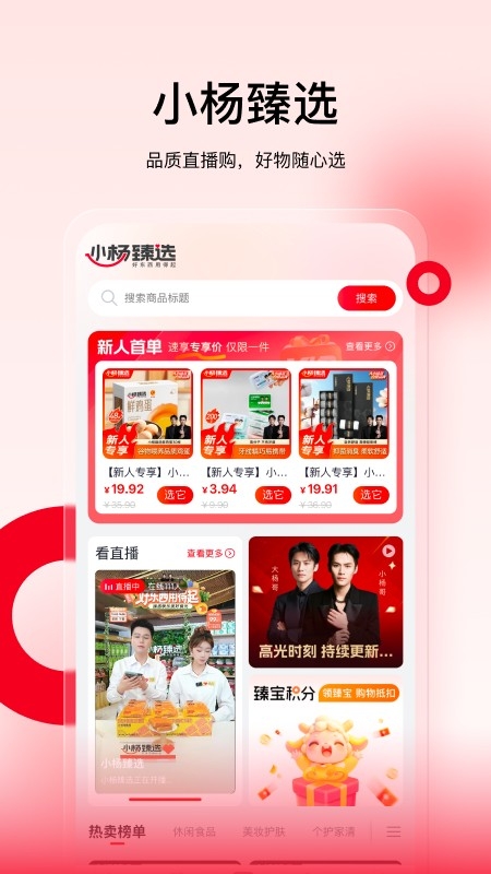 小杨臻选是一款与直播进行相结合的直播带货购物的软件。软件上具有非常多的软件自营的商品,有用户们需要的可以直接的在软件上进行购买,同时软件上还会以视频和直播的方式进行产品的介绍,让用户们全方面的进行了解到商品,让用户们买的放心,福利也非常好的。