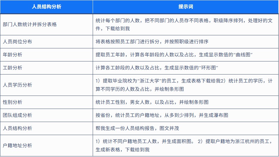 示例:“统计各部门人数,按职级降序拆分表格并下载”