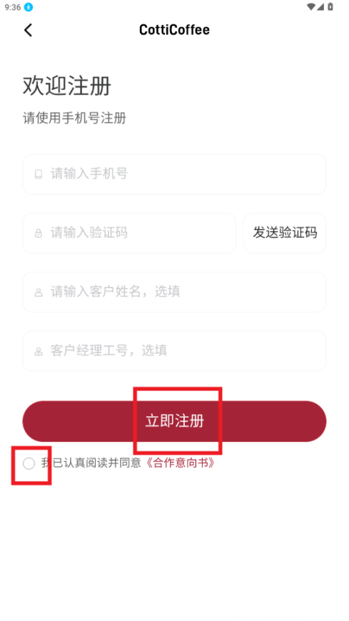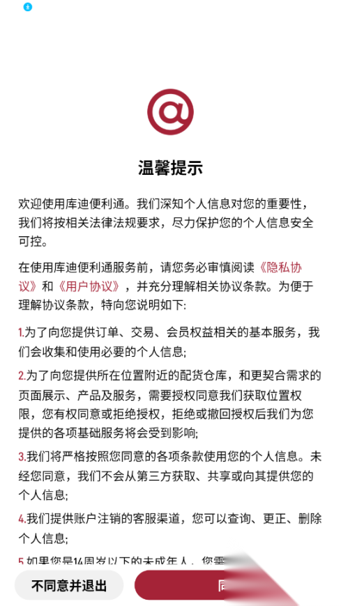 打开库迪便利通,进入之后,点击同意相关协议。