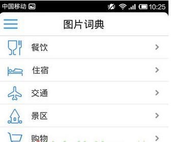 5、先看看图片词典,可以看到餐饮住宿交通景区购物的选项,这些都是挺有用,旅游平常会用到的。