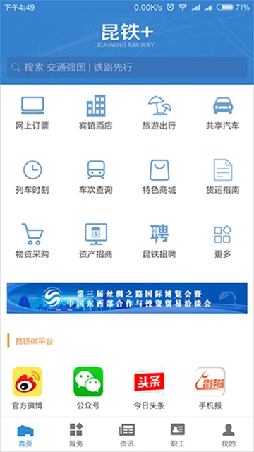 昆铁+APP是由昆明铁路局推出的一款铁路服务软件,是昆明铁路局官方APP。软件界面简洁功能强大,服务周到,融聚了公众服务、昆铁资讯、职工服务等丰富功能。