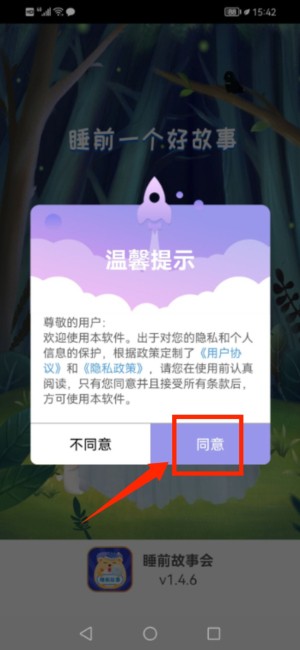 1.启动应用:打开睡前故事会App,点击温馨提示窗口的“同意”按钮,进入登录页面。