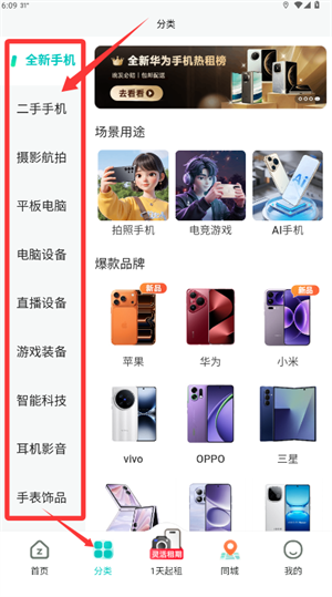2、进入分类页面,左侧栏展示有全新与二手设备等多种类别。