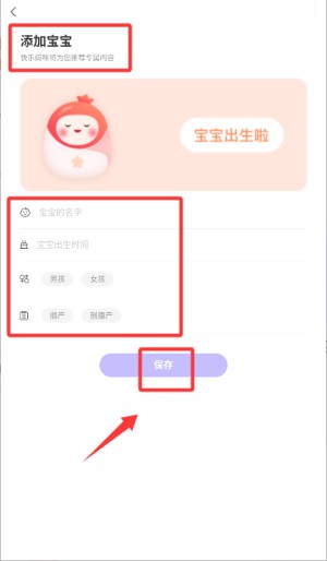 输入宝宝姓名、出生日期、性别等基本信息,点击“保存”完成设置,开启育儿记录之旅。