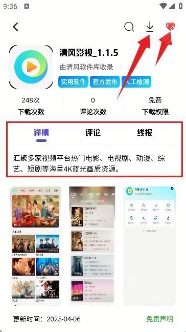 8、任意点开一个软件,可以查看关于软件的详情介绍,点击右上角的【↓】可以下载,点击【❤】可以收藏。