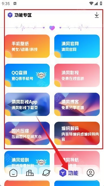 7、其次在【功能专区】中还提供了诸多实用的工具组件,如手机壁纸,QQ查绑,图片压缩等。