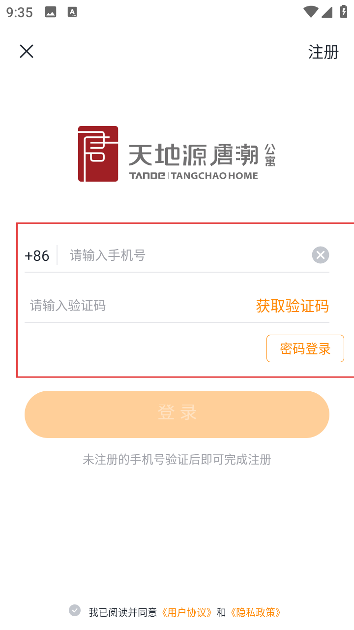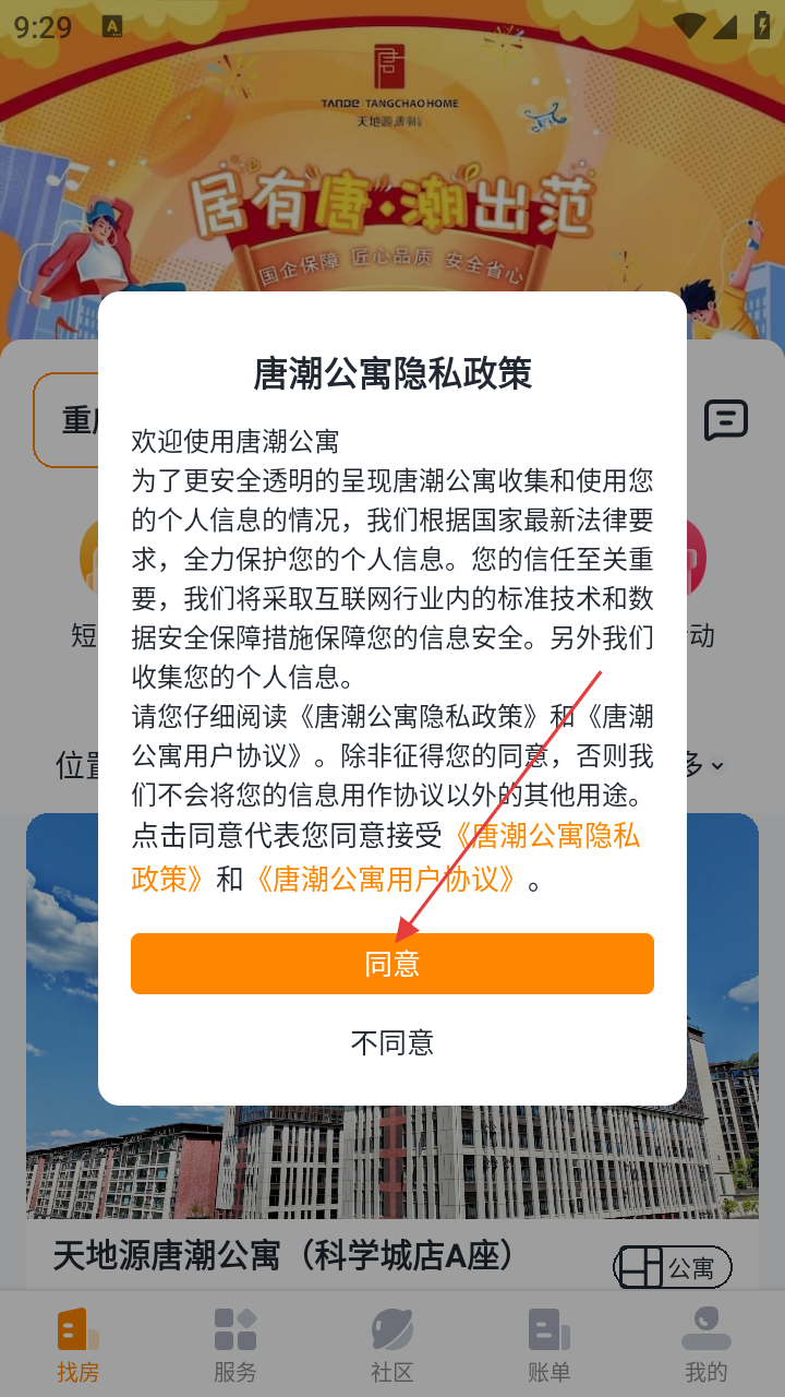1、打开天地源唐潮公寓相关应用,弹出“唐潮公寓隐私政策”提示框,点击“同意”以继续操作。
