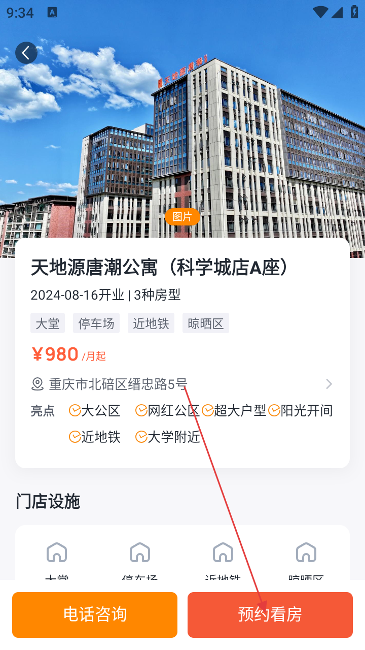 2、进入公寓展示页面,浏览天地源唐潮公寓(科学城店A座)等公寓的详细信息,确认目标公寓。