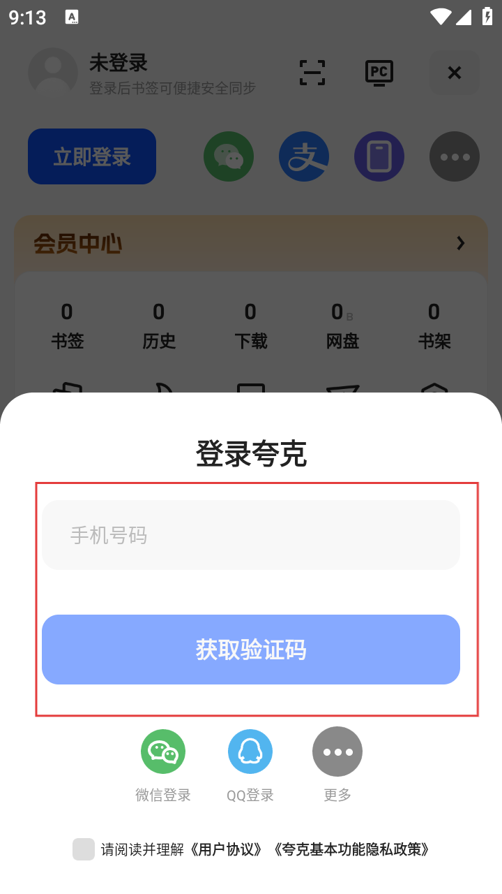 4、进入登录夸克页面后,在手机号码输入框中输入要登录的手机号,然后点击【获取验证码】,待收到验证码后输入,即可完成登录。