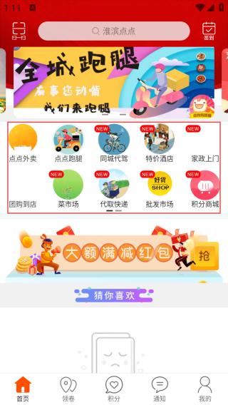 1、进入首页,可选择【点点外卖】【点点跑腿】等服务,利用【大额满减红包】优惠,按需下单生活服务。