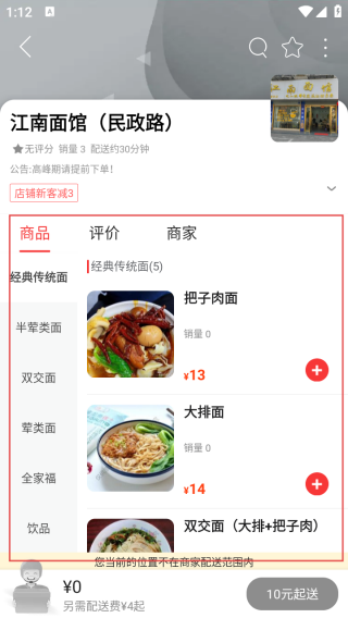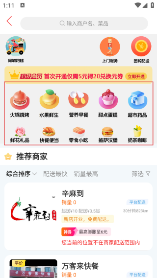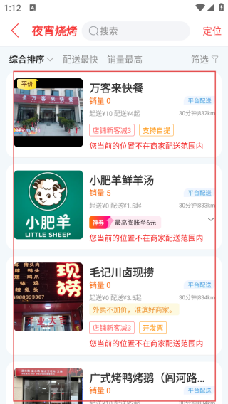3、搜索【夜宵烧烤】,按【配送最快】等排序,查看商家,注意配送范围提示。