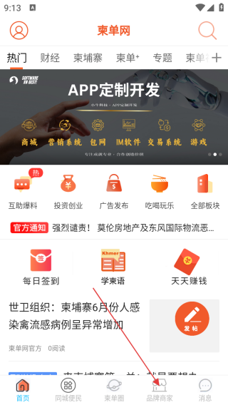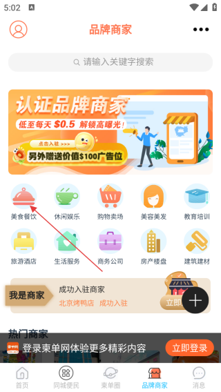 1、打开应用进入首页点击品牌商家。