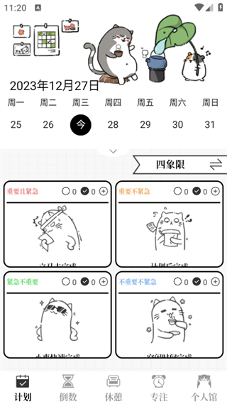 计划喵提供了三种科学管理计划模式,帮助用户划分计划的轻重缓急,合理规划计划的完成时限,并且还分设了更加直观的四象限计划列表以及多种小组件功能,让您的在使用手机的过程中依旧能查看到您的每日计划清单,实用性非常强大。欢迎有需要的小伙伴来本站体验!
