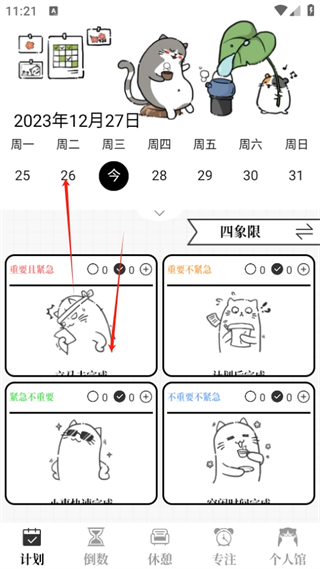 4、在计划中我们可以点击正上方时间处增设计划清单,只需点击四象限中的板块的右上角即可添加;